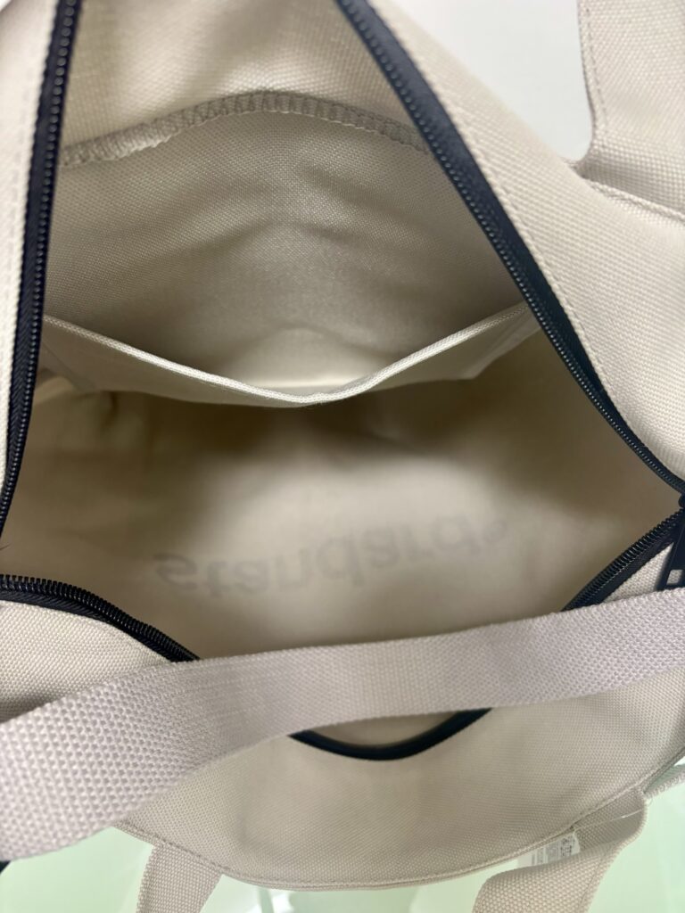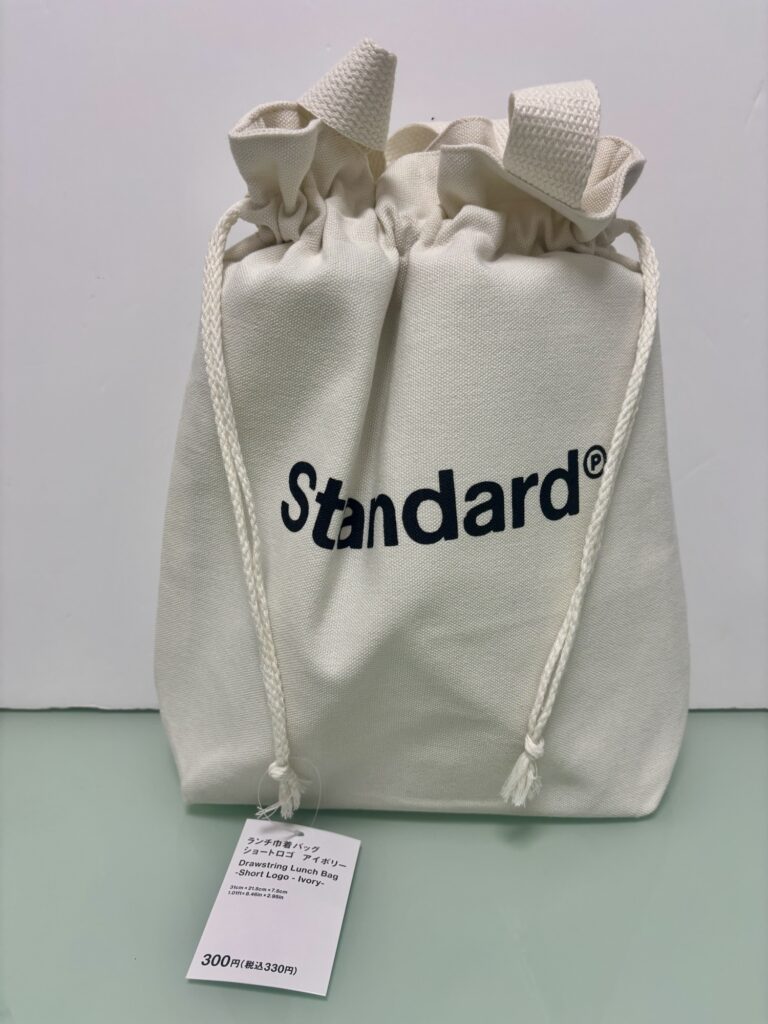まず一つ目に購入したのが、アイボリーのキャンバス地に太めのロゴが映えるランチバッグです。 汚れが目立ちにくいブラック系があればベストでしたが、店頭にはアイボリーのみ。ただ、実物を見ると清潔感があり、この生成りのような色合いもガジェット類と並べた時に馴染みが良いと感じています。