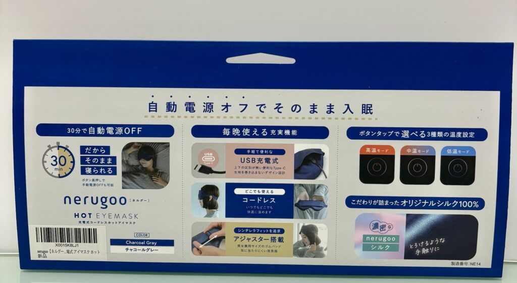 スマホやPCを見る時間が長いので、目の疲れも気になるし、ついでに目の下のクマにも少し期待したい。そんな感じでホットアイマスクを探していたときに見つけたのが、nerugoo(ネルグー)の充電式ホットアイマスクでした。